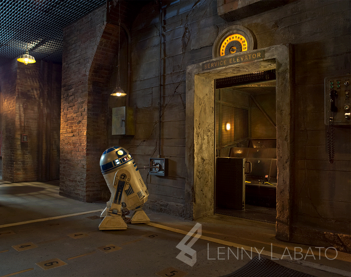 The concept is R2-D2 interacting with and controlling the drops of the Tower of Terror attraction. It gives a clever nod to the scene in the original movie Episode IV: A New Hope in which R2-D2 plugs into the controls of the death star to stop a garbage compactor and save his friends.